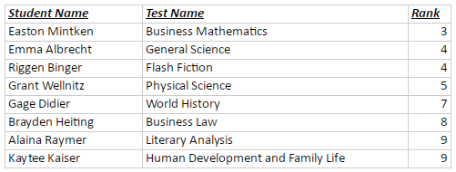 Thirty-six students competed at a multitude of tests on October 15th at CSC Scholastic Day. These are the students that placed within the top 10 of their respective competitions.