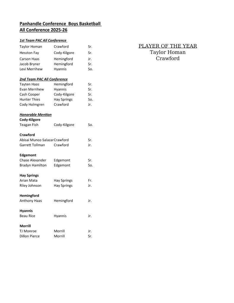 Devyn Young, sophomore, Hay Springs: Young was fourth in scoring and double-doubles and fifth in rebounding for a 15-6 Hay Springs squad, averaging 17.8 points, 11.8 rebounds, 2.0 steals and 1.3 blocks as an underclassman.